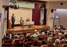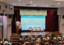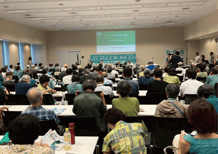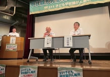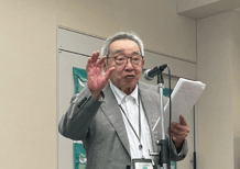 支援者集会の会場となった日比谷コンベンションホールでは中野弁護士の模擬プレゼンの動画をご覧いただいております。「黒い雨訴訟」の原告・高東征二さんが応援に来てくださり、支援者集会でスピーチをしてくださいました。